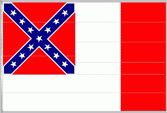 In fact, the banner shown is neither of those. What is shown is the elongated version of the Confederate battle ensign (specifically designed as the battle flag of the Army of the Potomac, which was later renamed the Army of Northern Virginia), and it is called “The Southern Cross.” The battle ensign itself is square, and the elongated version was used as the Confederate Navy jack, flown on warships in battle. Here is the battle ensign as used by land armies (and which still appears on the State flag of Mississippi) [Update: On January 11, 2021, Mississippi installed a new State flag without the Confederate ensign.]
